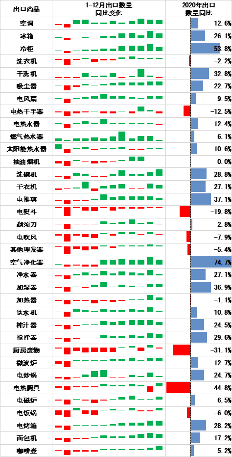 2020年上半年随着居家时间增多,对冰箱冷柜和部分厨房小家电产品需求率先增多。进入下半年,得益于供应链的快速恢复,海外居家经济的需求拉动,绝大部分品类产品订单大幅增长。以吸尘器为例,上半年表现低迷,进入5月份,订单翻番,全年大幅增长。纵观全年,与防疫相关冰箱冷柜和厨房家电,以及空气净化器、加湿器等居家创新产品增幅明显,而像洗衣机、电熨斗等与户外衣着相关的产品,以及空调等与商用相关的产品表现乏力。大家电(冰箱、洗衣机和空调等产品)产品中尽管冰箱一枝独秀,但整体出口乏力,小家电(环境、厨房、个人护理等产品)产品各品类表现突出,二者出口形势对比鲜明。