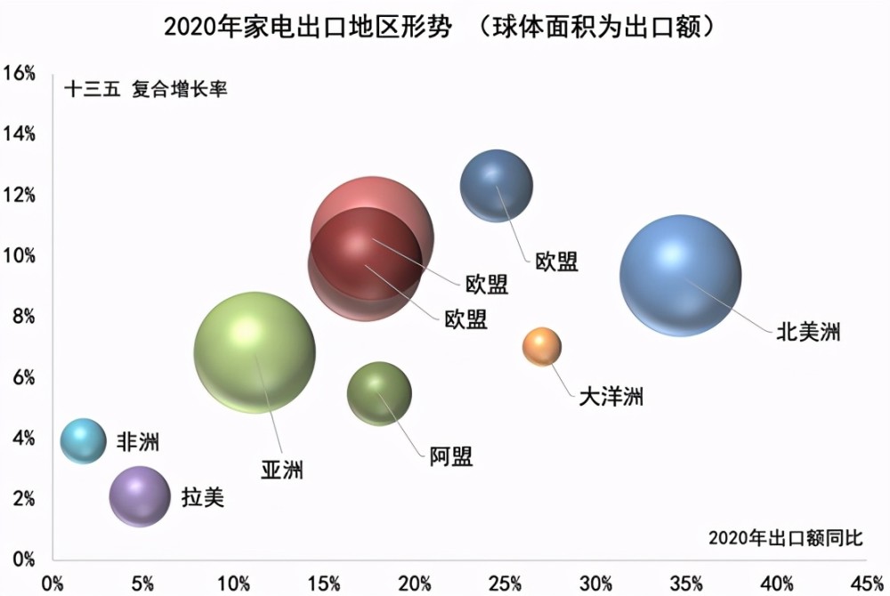 2020年疫情初期,受供应链影响,2月份各市场出口形势均呈现下滑态势,随着复工复产的有序进行,作为世界家电最大供应基地的中国,从3月开始产能快速复苏。东盟和是日本市场率先复苏,3、4月份绝大部分家电工厂不断赶工完成积压订单,但行业产能还未恢复至疫情之前。进入二季度,产能基本恢复至疫情之前,北美市场逐步复苏,5月份,疫情在全球蔓延扩散,包括欧洲、印度、南美洲和中东疫情加剧,其港口出现短暂封闭和停摆,对这些市场出口出现短暂回落,这一期间订单均来自于美国等主要市场。从6月份开始,全球进入疫情的常态化,而中国的供应链优势开始显现,宅经济拉动效应逐渐显现,全球家电对中国的依赖程度与日俱增,我对拉美、印度等市场也开始全线增长。