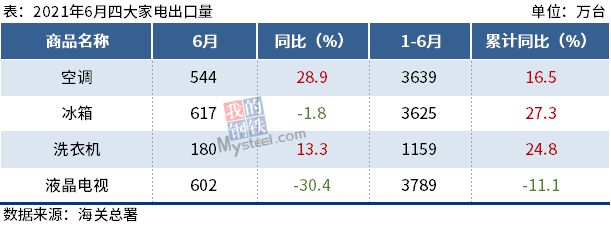 海关总署最新数据显示,2021年6月出口空调544万台,同比增长28.9%;1-6月累计出口3639万台,同比增长16.5%。