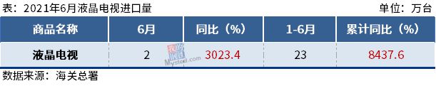 6月出口液晶电视602万台,同比下降30.4%;1-6月累计出口3789万台,同比下降11.1%。6月进口液晶电视2万台,同比增长3023.4%;1-6月累计进口23万台,同比增长8437.6%。