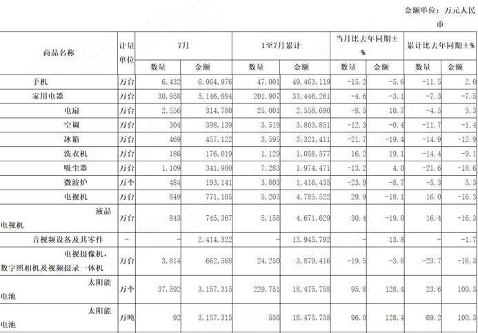 7月出口太阳能电池92万吨,同比增长96%;1-7月累计出口556万吨,同比增长69.2%。