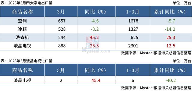 3月出口液晶电视888万台,同比增长25.3%;1-3月累计出口2301万台,同比增长12.5%;3月进口液晶电视2万台,同比增长45.4%;1-3月累计进口6万台,同比下降40.2%。