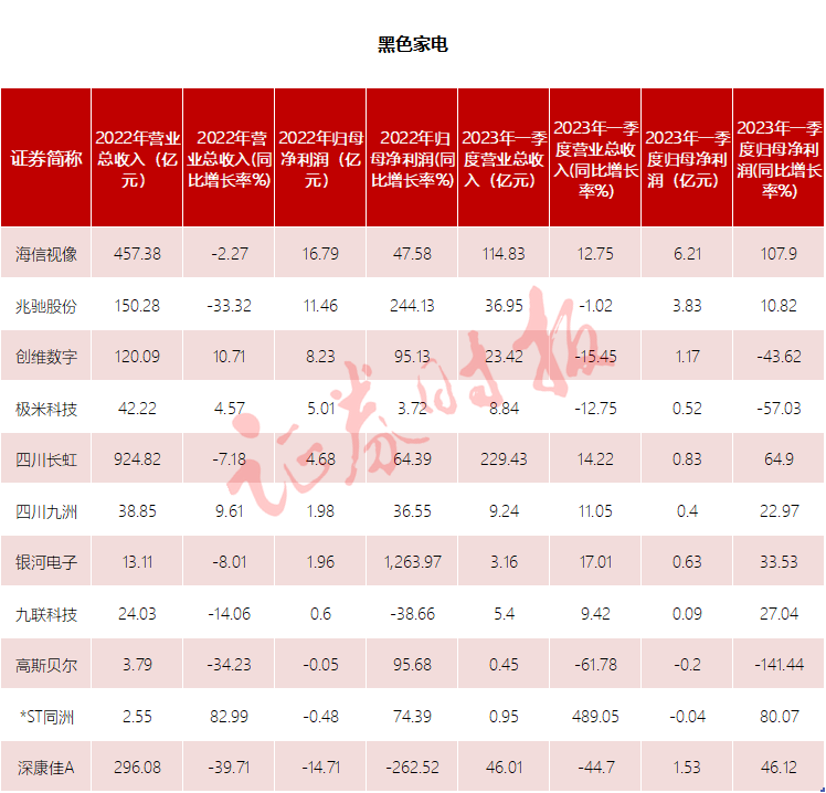 黑色家电方面,上市公司业绩分化明显,海信视像、四川长虹等公司无论是2022年还是今年一季度,业绩均实现快速增长。兆驰股份、创维数字等2022年业绩增长迅猛,但今年一季度明显乏力。