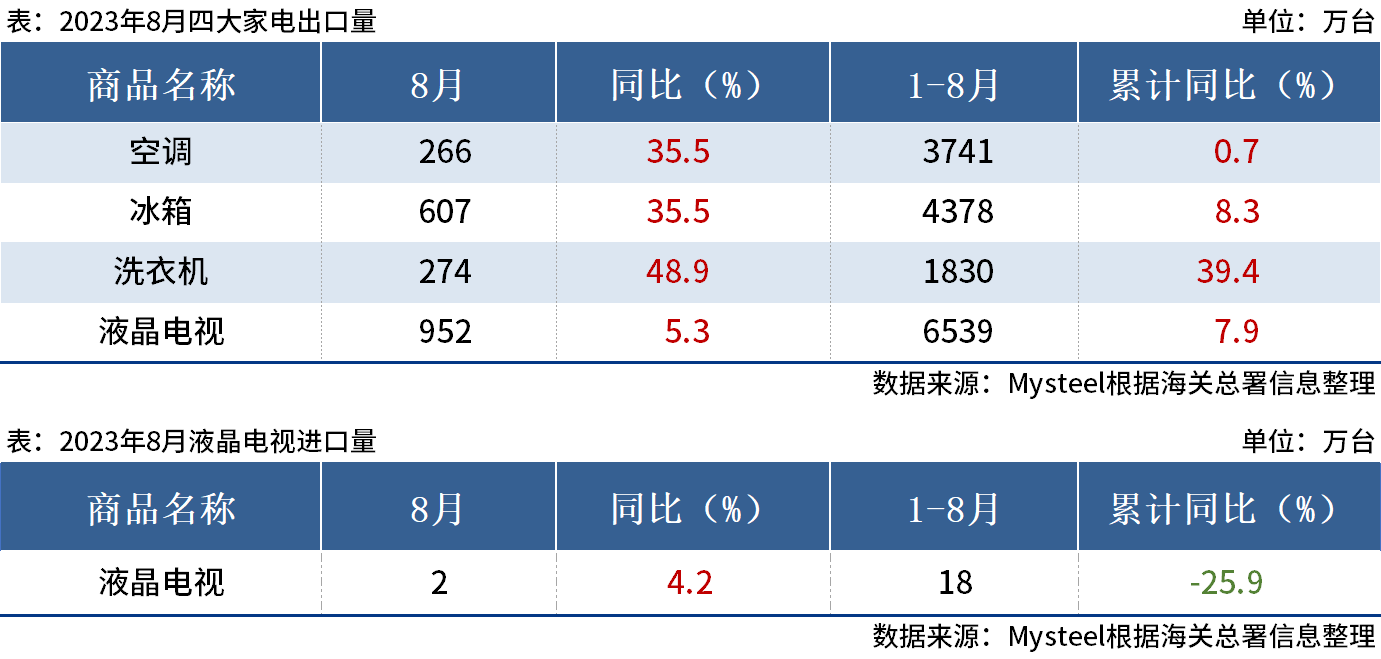 8月出口液晶电视952万台,同比增长5.3%;1-8月累计出口6539万台,同比增长7.9%。