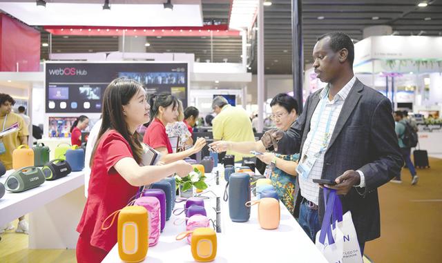 第135届广交会将于4月15日至5月5日在广州举办。图为第134届广交会上,来自苏丹的采购商在智能音箱展台洽谈 新华社图